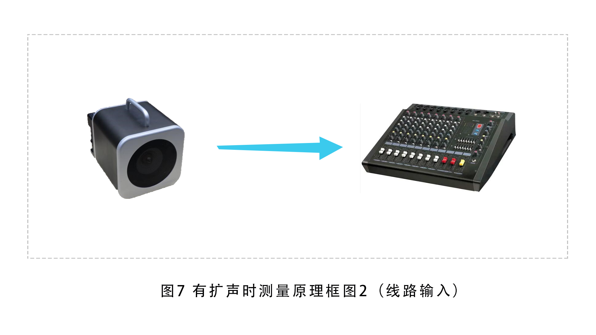 如果被测场所内扩声系统不含系统传声器而是直接通过播放器播放音频,则将智能音箱中线路输出的电信号输入至扩声系统的线路输入。测试信号通过扩声调音台线路输入扩声系统,经扩声系统使扬声器系统发声,由声级计按相关标准要求测量扩声系统和声学场所的各项指标。